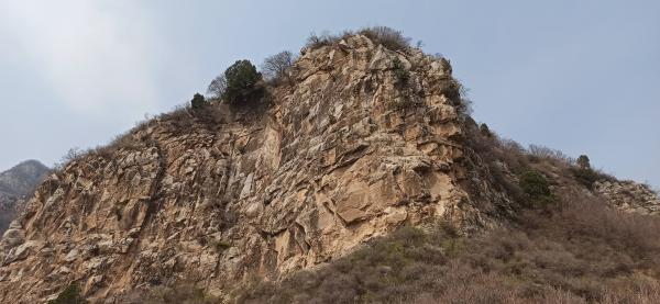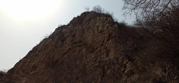 十三点五分,来到鸡冠子崖东峰脚下。这一面断崖上有个醒目的大洞。