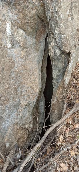 十四点十五,遇到一个深洞。一面石质山体被一块大石头拄住,露出窄窄的洞口。如要进洞,须带长长的绳索。