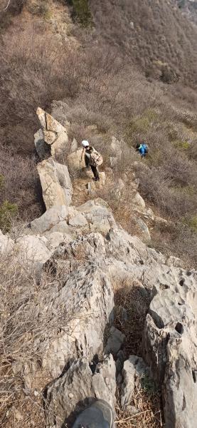 上行,十二点十分,遇到一面断崖。须绕至右侧,攀石上脊。