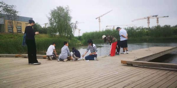 藏宝完成后,一行人出发前往马家湾湿地公园,沿河漫步。经过治理的萧太后河一改往昔的臭气熏天,河水清澈,超多钓鱼的人稳坐岸边。在没人钓鱼的地方,我们往河里扔扔石子儿,(本来河水也在流动,)二毛说:快看,波纹也跟着流,好神奇啊。