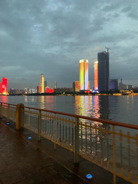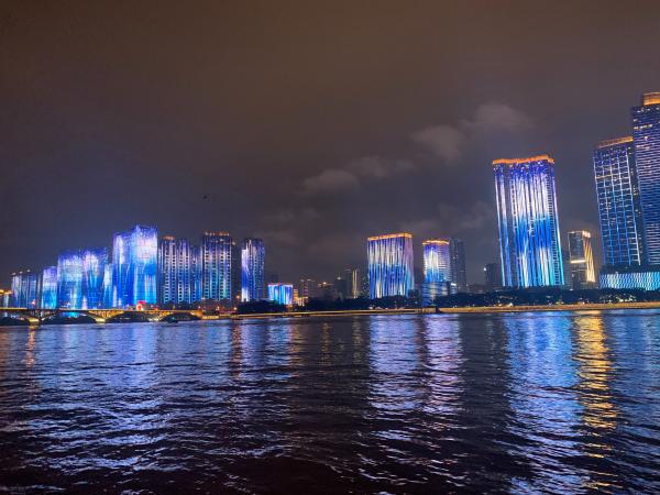 夜幕降临正好走到了洲头,华灯初上,城市之光逐一点亮,临水而立的大楼,在整体的灯光设计下,色彩缤纷的呈现出一幅幅生动的图案。远远地看着,就像是一幅无声的彩色电影,那边的热闹在这里却是静悄悄的寂寞。