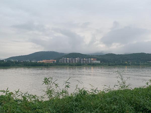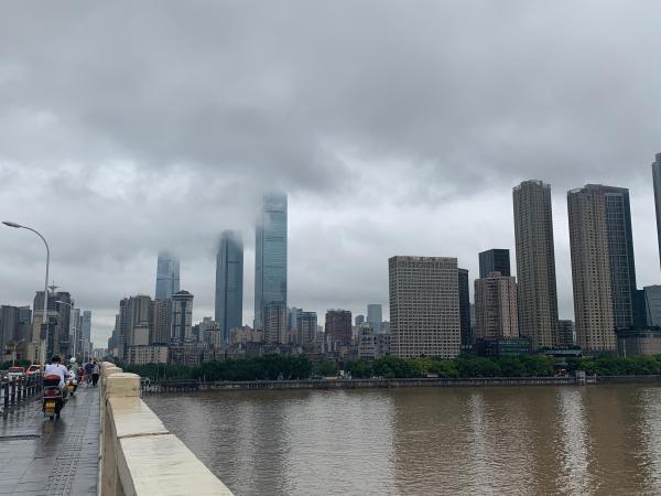 上到湘江一桥,视线可以到天尽头,顺着五一大道长沙火车站清晰的呆在路尽头,湘江边的高楼也被云雾笼罩,对岸的岳麓山脉如水墨画,浓淡相宜。