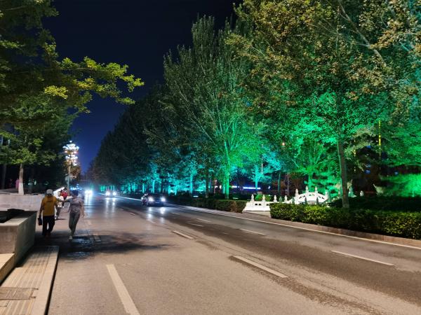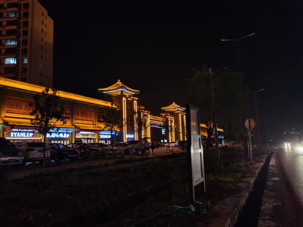 没怎么看地图,凭着直觉走向灯火通明的方向。刚进市区,看见一座还没完工的大庙,然后是一个被一连串灯镶上金边的仿古建筑,看样子像博物馆或者古玩城,然后,其实是一个小区。