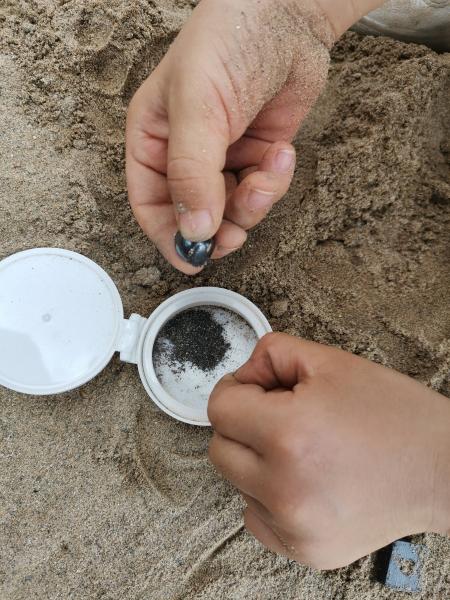 往回走的时候路过那个小小小的游乐场,孩子荡秋千,我们树荫下吸沙子里面的铁屑,很是自然惬意。满意的一次出行