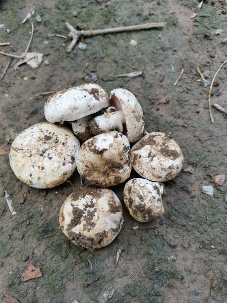 树下观察有破土而出的迹象的,土地被顶开有裂纹,把泥土挖开,就见到蘑菇了,跟市场卖的口蘑一模一样。
