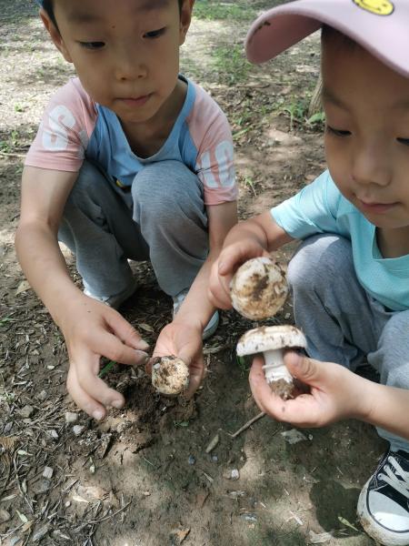 两个孩子自己也在采蘑菇,挖出蘑菇后兴奋得一直蹦蹦跳跳。