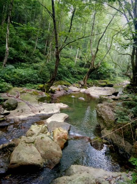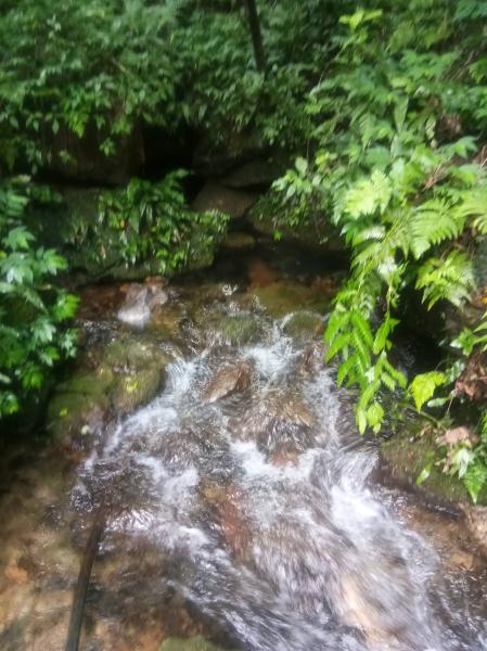 过溶洞取水口后,便完全溯溪而上,大概要跨越小溪十余次,溪面不宽,但要在不湿鞋的情况下跨过,必须踩着水中石头才能过,而垫在水中的石头不大又不稳,极易打滑落水,须谨慎小心。我们就湿了鞋,在回程中,柳暗花明还滑坐水中,湿了身,情急之下,甩掉了登山杖,关键是还找不到了。