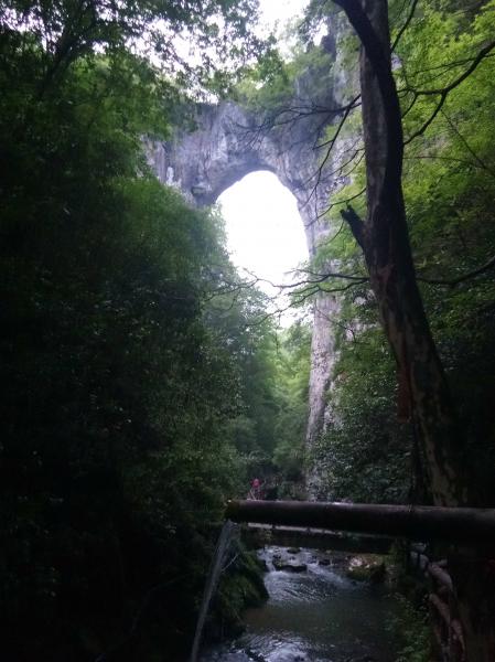 驾车下山后,暮色中参观仙人桥景区。典型的岩溶地貌,巨大的地下河,以愚公移山的毅力,年复一年,日复一日,侵蚀着石灰岩体,形成百余米高的沟壑绝壁。下至谷底,空无一人,宛如进入岁月长河,与天地交流,与时空对话。有两处叹为惊奇,一是入口处的太古泉,数股清泉从不同的岩洞中涌出,汩汩而流,形成数个微型小瀑,岩石上长满青苔和蕨草,正所谓清泉石上流,美轮美奂雅到极至。二是高悬的仙人桥,水蚀山体,而唯余此岩,形成高60余米,宽20米的,中间狭窄,仅数米,桥(洞)下清溪蜿蜒,险峻壮美。