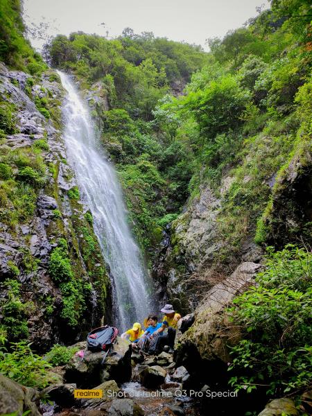一波未平,二波再起。顺溪而下,时缓时急。有几处溪瀑,悬崖峭壁,湿滑难行。在开题人的反复探寻,实在无路的情况下,大家象猿人一样攀石牵藤,几番绕行,几次跌坐,才汗津津、颤兢兢、力微微、脏兮兮地降至瀑底。所幸安全。唯柳暗花明跨溪时脚滑,虽隔着登山鞋,仍把大脚趾踢破,忍痛继续趔趄蹒行。