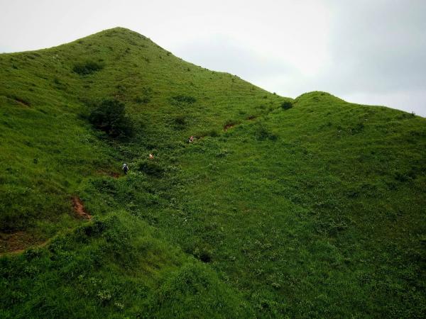 是日,车停鸾山银坑分水垭,沿水泥大道直上。一路急升,汗如雨下,直到山腰在建小庙,水泥路变泥路,草甸开始铺陈。再上,视野开阔,可远观群山,已是心旷神怡,喜洋洋矣!