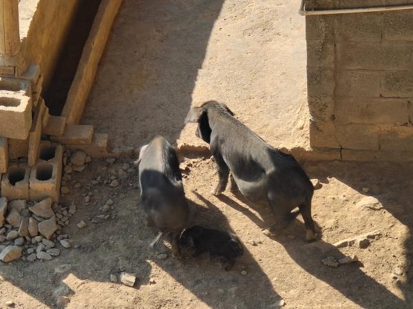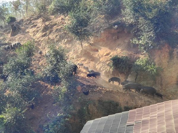 这是一次名副其实的猪狗相伴的出行。路上遇到了满山的花猪和黑猪,黑猪仔散养在山里,见到人来慌不择路的奔跑,很像非洲草原上角马迁徙场面