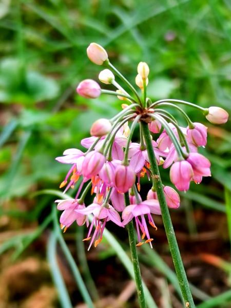 (藠子不守二月开花的本分,也来凑热闹。)农家菜地里绿叶映衬紫色的藠花,分外秀美,绿色的杆子顶端挂着一朵朵伞型小花,吐着黄色花蕊,像一盏造型独特的紫色吊灯。