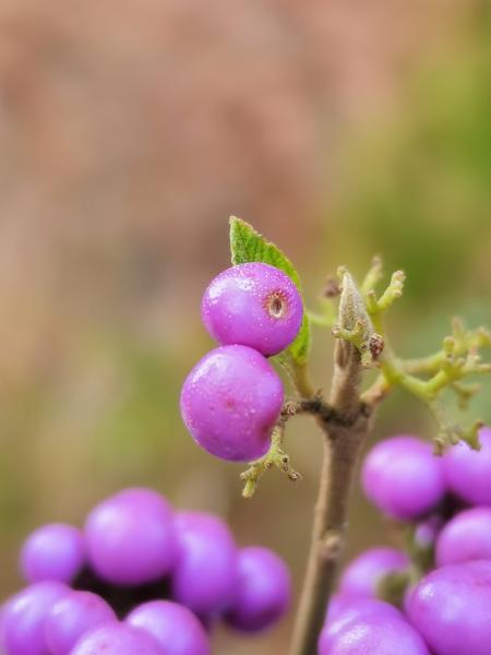 紫珠,一球球紫色的小圆果串在枝上,株形秀丽,果实色彩鲜艳,珠圆玉润,犹如一颗颗紫色的珍珠。紫珠的花语有“聪明”的意思,紫珠有“家庭和睦”,“来年和睦”,“来年好运”、“长命百岁” “紫气东来”等花语。迷茶分享一支给我,回家插花瓶里面,确实赏心悦目。