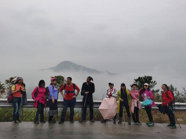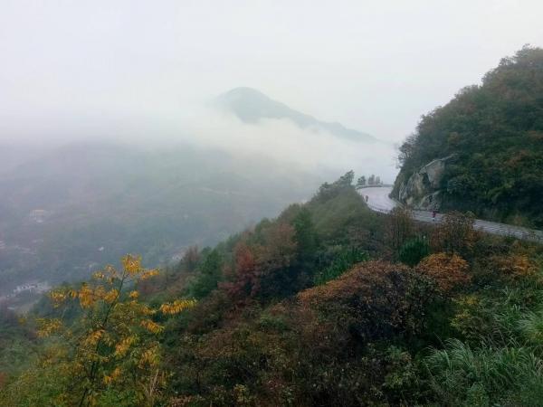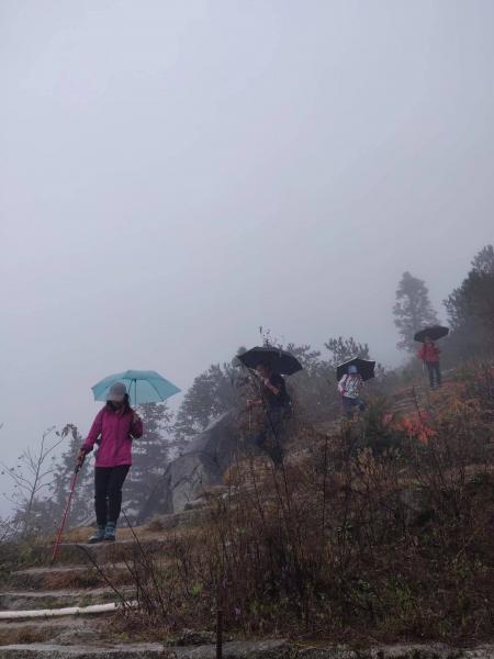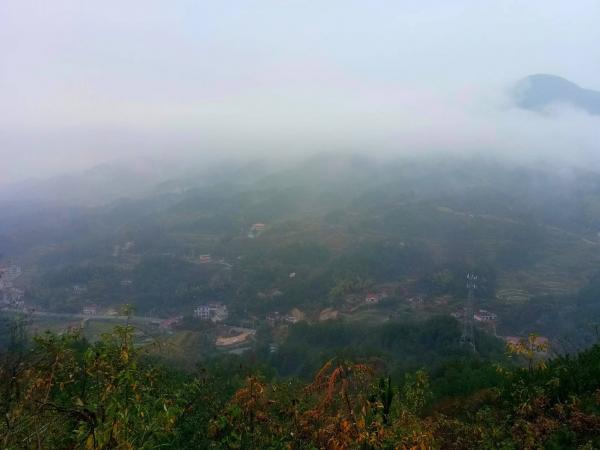 课题如期按计划进行。山下清冷阴沉,山上云缠雾绕。徒步在云里雾里中缓慢上升,又缓慢下降,整体节奏不快,强度也不大。先是很好走的砂子机耕道至山腰,远处升腾起一层云雾,山尖漂浮在云层之上,仙气飘飘;透过云雾窥探,山间黄绿斑驳,山下阡陌交通,屋舍星罗棋布。