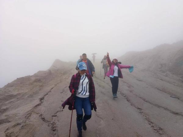 再上,便是风电大道,大雾茫茫中,巨大的风电车若隐若现,发现强劲的轰鸣声。有毛毛细雨飘落,大部分人都撑起伞来,蓝虹、木瓜自恃以冲锋衣牛B,功力强大,硬挺着,多次提醒穿 雨衣,但就是不穿。一身湿漉漉,直到中餐后才穿上雨衣。