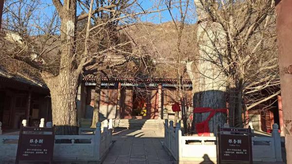 再出发,由北村进山,试探沟中小道,切近北桑路。北桑路(北村-桑峪)、南桑路(南辛房-桑峪)沟口被定都峰景区阻断,没找到可以绕行的小道,只得强攀而入。15点半到广惠寺,古树参天,清幽拙朴。