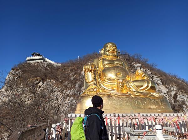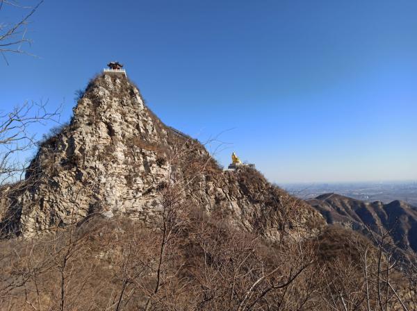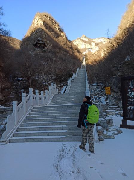 未经塔林,直登“北京制高点”,沿栈道向千灵山行,从第二支脊下玉亭沟,进入景区。从仙人谷上行,幽松夹道,雪毯铺阶。千灵山属溶洞地貌,号北京最大石窟寺群,途次达摩洞、关公洞、药师洞、极乐洞,略观沿途景物,窥测西崖龛穴,登顶极乐峰,擂响祈福鼓。