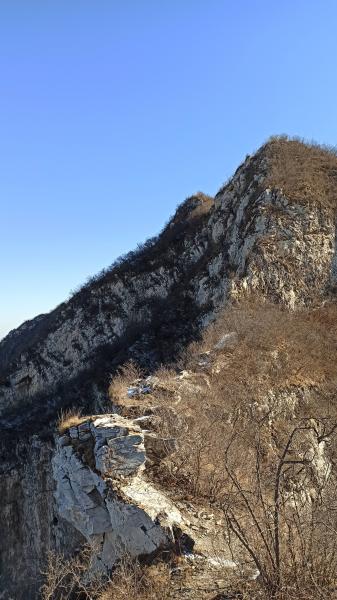 才11点,回悬空栈道,由西向山腰小道,经垭口,登马鞍山顶,过铁三脚架,下行山脊。脊瘦径断,临渊而踏雪,风戾草颓,反崖以寻壑。