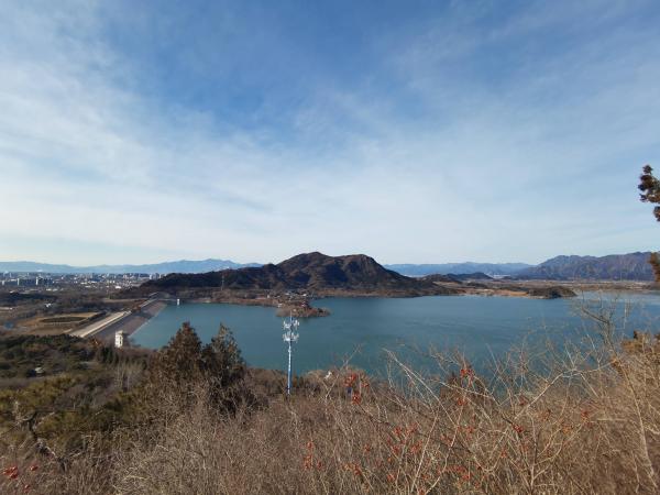 离山远坝,出山之后,回首而望,碧天斜盖,青树为支,山脊为柱,枯枝败叶不废其功,若是三月花开而来,素白之间,更为漂亮。