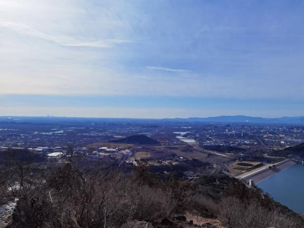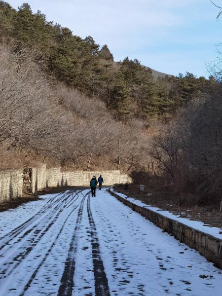 但是我的愿望落空了,我们沿山而爬,顺脊而上,伐荆阔路,粉紫色的沙石铺满一路,山路盘结,左右树木,回身而望,水库正好可以看得清清楚楚,远山如墙,环护着昌平城,近山似屏,守候着十三陵水库。