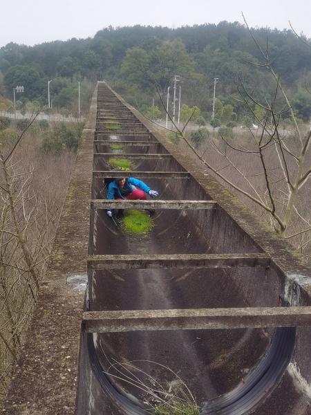 我们当然不想平淡地路过这地方,附近的两段高架渡槽成了检验人们是否隐藏着恐高症的金标准,9人中,我、山雀、叶晓泠、哥乐走完全程,能量在沟里走得满身大汗,羞山红叶走了一半又退回去了,在路上和梅来到上面看了看就下去了。