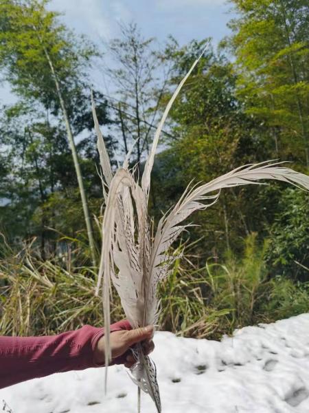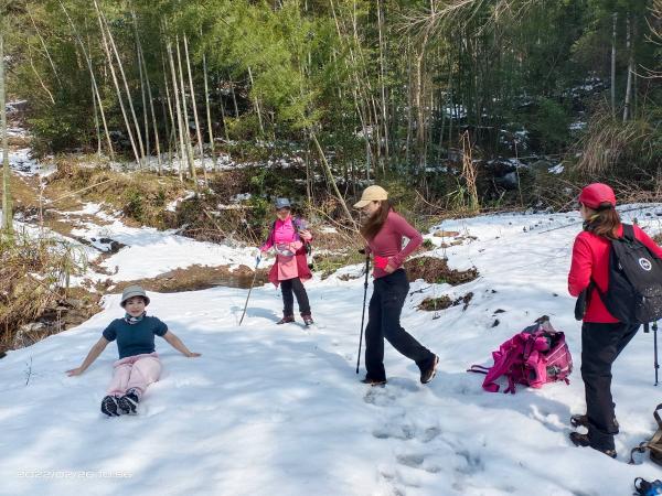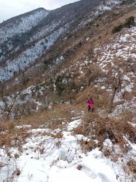 沿村村通前行5里,便是急升的机耕道,是村民砍竹子开的,极大的方便了我们的爬山活动。路上渐有积雪,大家很高兴,越往上爬,积雪越来越多,我的网面鞋已开始进水;到达800米高处,是一段背阳路,积雪很深了,鞋已深陷不见;一处水流将雪路冲成两段,女人们就在雪地上撒起欢来。我的鞋子全湿透了,我想山上的雪会更厚,再上爬肯定是湿不可救的了,犹豫着要不要下撤,找个溪谷玩下算了。试着问了一下,柳老实响应着,其余三人对爬雪山兴致很高,我也就半推半就的说继续爬吧。