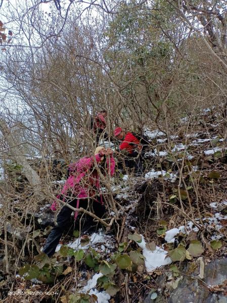 饭后,再走一小会,竹道截止,沿羊道续升。林中积雪更厚,深浅随意,有的背荫处积雪 深达50公分,一不小心踩入,人都起不来,是到了关键时刻了,是到了见真功夫的时刻了。我在前面带路,山、忆随后,童、柳则殿后,几步一停,咬牙上爬。