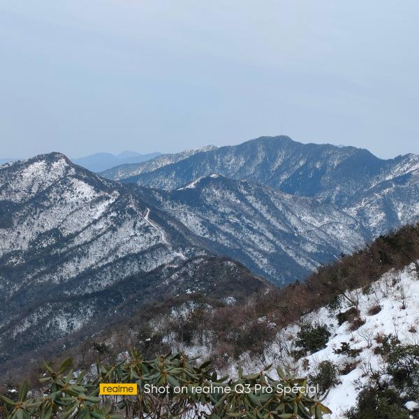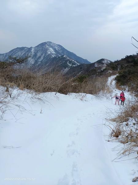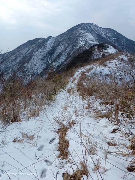 本题位于连云山脉中段,计划从深谷中坪上石柱峰,在山脊上走2公里,到达黄草岭, 再沿箭竿山下。起步时,可以看到前方高耸山脊,盖有白雪,这超出了我的预期。因为我考虑今天没雪,所以穿的一双网面的夏季登山鞋,观看一下,柳老实也是;其余三人是正规的冬季登山鞋。