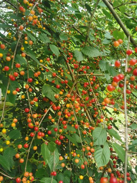 那就绕周围走走吧里面反正没有笋子和茶叶呢。到了山后面,这里的鸡婆子笋成群我们很快就拔了好多,收获还不错,茶叶也在这里有很多,这个时节的茶叶做熟茶正好口感淳厚。吃完午饭休息一会我们继续前进,发现一条小路索性钻了进去,走着走着突然看到有人露营,再走近一看人越来越多,旁边还有好多樱桃树,心想难道我们误打误撞闯进那个刚刚需要门票的樱花谷了吗,路边的标识,景点已经确定这里就是樱花谷心里想着这次是不是不赚了,在这里我们每个人都饱餐一顿野樱桃说实话味道不比超市买的差