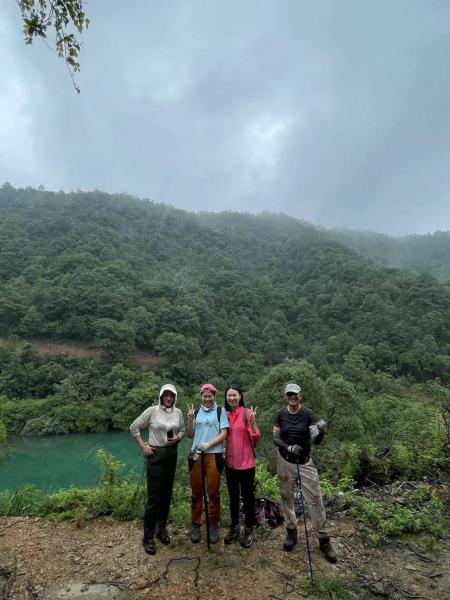 到了山脚下一起合了个影。白衣服在树林里面走己经面目全非只能扔了。下午一点钟的一行六个在附近吃了中饭后,由于被淋雨全身湿了我和欣欣四个决定回家,自在鱼等二个继续爬二坐大山。