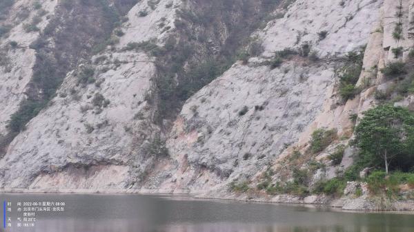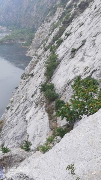 前几年落坡岭水库大坝下面是干河道,所以上到V垭口非常便捷。这几年永定河持续放水就造成了沟口直接就在水下了,去沟口横向是60度平滑岩石。第一坡段应该十多米高。上面有个疑似横向石缝还有小灌木,由于没有绝对把握这次没敢尝试。