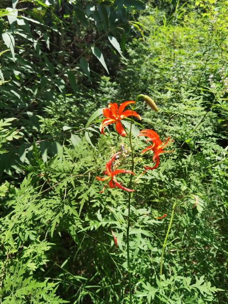 闲聊少许,回程而归,下山有陡,峭壁为道,松间柏下,草中急行,相伟居然发现了两株红色的百合花,红艳艳的,真是难得!