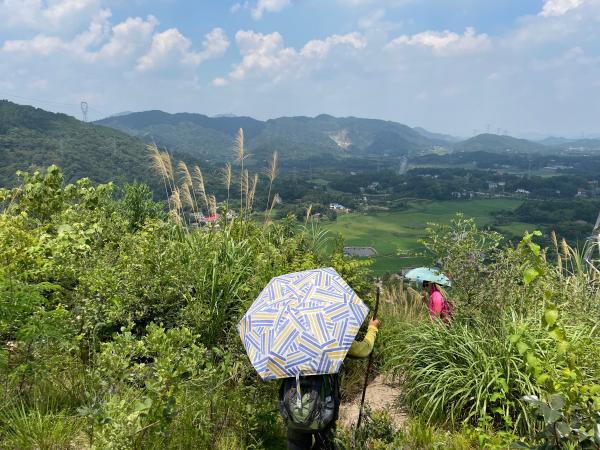 在绕过朱家冲的小山时,队伍钻了一段树林,虽然阳光没有照进来,但却没有一丝风,一阵暴汗让大家领略了三伏天的威力。伴随着气温上升和体力消耗,大家带的水在短时间内急剧减少。在一段写有禁毒标语的渡槽上,阿混走来走去表演了一番,本来还想跳下来,大家担心安全劝他还是别跳了。绕过立新水库时,大家诚挚邀请阿混下水一游,其他人顺便休息一下,不过水质原因,队伍没有停留。绕过周家冲水库,道路在草丛中消失,队伍第二次受阻。经过升幅约20米的爬升探路,饱经酷热和刺痛之苦,我们终于在12时重新踏上半山的大路。路餐休息之后,阿混说脚扭了,与水牛、怡茗一起先行撤退,剩下三位女将和我。原以为开题人会走山上的大路,结果我判断错了。我们开启了第三次探路爬升,一直爬上山顶,翻过去就到了万谷岭村。一路颇为艰辛,只记得大9M的防晒衣被刺挂破了几个大洞,云端漫步多次要停下休息,然后发现自己的水已全部喝完。但最终我们在登顶后,发现了多个铁塔,当然也找到了下山的路。站在山顶望北山那刻,心情颇为舒畅,虽然阳光正盛。