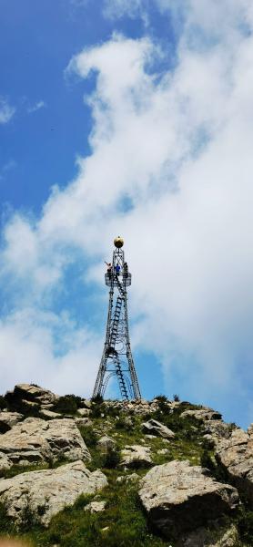 可能是泥石流造成山体滑坡,去往玉皇庙的小路断了。于是钻进深山老林,踉踉跄跄,左突右冲,爬上坡顶,找到正路,能看见远处的小庙。虽然坡度不大,道路平整,然而途中行进颇感吃力,一路尾随,直到有人要上厕所,并且要等到绝对无人,我才终于短暂不在队尾。不多时玉皇小庙就在眼前了,大神级的社友们纷纷爬上山顶一个废弃的气象塔,摆出各种pose,拍照得瑟。