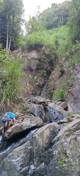 快到南门时,路旁有条小溪顺流而下,从这上去就可以绕过大门。溪水人如其名,见水就兴奋,便决定由此溯溪而上,小眠也跃跃欲试,自告奋勇要和溪水一起走,我和在路上有点怂,估摸着溪流之上只怕有瀑布,那就不好上了。在路上在溪边发现一条向上的小道,我们便决定从这走。天马贴心地说:“你们慢慢走,我在下面等你们一下,如果不好走,就下来,我送你们从另一个地方上去。”在路上和我不到十分钟便上到一条机耕道,再沿机耕道往上走几百米便到了马路,成功走出一条用时最短的捷径。这时溪水他们还不见身影,电话联系后,才知道果然遇到了瀑布,溪水是遇到南墙也不愿回头,硬是于无路处闯出一条道来;小眠则退回原地,从我们之前的小道上来。