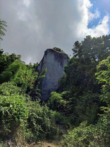 为了避免蓝虹一行感冒,我们去向下一个目的地:白面石。天马和蓝虹因为要开车就没有上去,我们八人沿路而上,途中只遇到一个戴纱手套的老大哥,他嘱咐我们要从石头的左面上去,右边的路不好走,要镰刀开路。“白面石”形如其名,是一块高约二、三