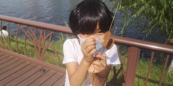 小飞猪发现了芦苇棒,孩子们拿着像极了烤肠。