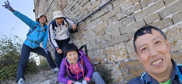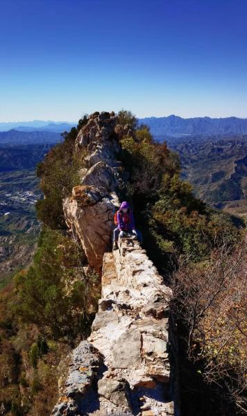 这时候SOSO在我后边说我要坐着挪过去,这燃起我的好奇心,暂时忘了恐高,爬起来回头观望,果然骑坐在单边墙上,我还回身照了张像!