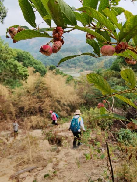 W179 8:30准时发车。9点过8分到达民望村,开始上山,经过滑翔基地的田块,被要求扫场所码,头一回田间马。起初的路基本上是重复的,古道西风,景色优美,非常顺利的找到了柿子树,后来才想起没把老乡的竹竿归原,惭愧。桃就费了周折,午餐毕开拔的时候,走友蓦然一句“狝候桃”,得来全不费功夫。满载由于干旱水色欠佳的柿桃,继续前行。往后的路途就是名堂搞尽,钻棘篷,滑滑梯,攀树藤,在干枯的溪流石上跳跃,在倒卧的竹杆间穿越,大伽一句话总结了:走出了大山的味道。下山3点了,原计划有点赶,改去仙麋桥上w179,4点多上车,结束行程。