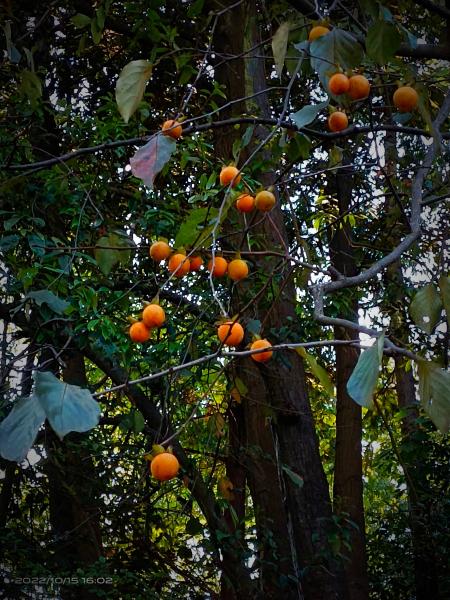 没看到什么可采摘的野果。下山沟中,几片枫红,一树野柿,高悬枝头,斜阳泻注,算是浓抹重彩的秋日妆容。