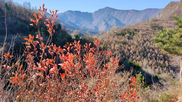白羊沟视频,山坡光秃秃,红叶木了。选避风地方?杏树台。