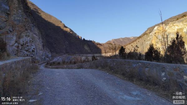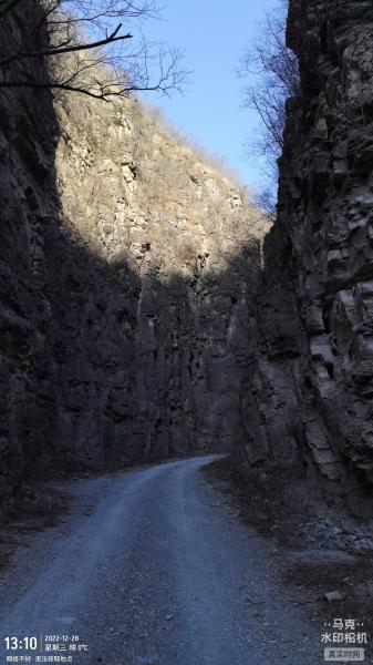 又朝东转绕过一个羊场,有石头铺成甬路,从河北镇烈士纪念碑北侧下到北港沟。这条沟走进去6公里 ,有废弃房子和多处大型采石场遗迹,局部是窄窄的如东龙门涧的曲折路,一半是水泥路,后一半是石子路,汽车可以开进当然底盘要足够高。终点是遗弃很久的废村梯田,最近有人维修路。在离河北镇4.5公里处有条岔路朝东北方向,地图显示那里离张良洞更近些,今天时间关系没法进行考察验证。沟里面有四处院子存在狗叫,最后一处两条半大狗未拴,但没有追我,有一条还被我吓跑了。