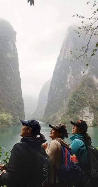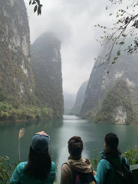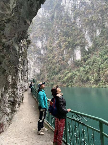 课题成员4人六甲镇政府集合完毕驱车来到小山峡景区,船票80元,徒步走栈道也得买10元门票,买好票进入水电站姆洛甲水电站,码头与电站大坝的天堑变成“天梯”,呈现在眼前的“高峡出平湖”的奇观。景区是典型的喀斯特地貌,形成山峻、峡幽、洞奇、水清的特点,来到码头,有人热情的跟我们打招呼,想邀我们一起坐船游,我们还是坚持徒步,用脚来丈量每一处风景,我们选择一条沿河边比较近的道路往前观景,路的径头一处正在施工的工地,拦住了我们的去路,我们只好绕道而行至课题的终点。
