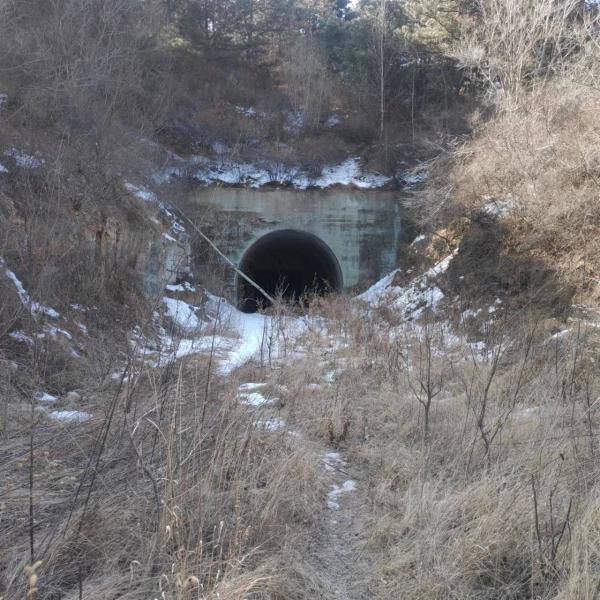 继续前行,过西沟(岔道口),直奔锦古铁路的海拉岭隧道口,来到隧道口,发现原来的老牌子已经换成了新牌子,此段铁路线号称最密集的人字型铁路,一共用了4组人字型铁路展线,下边大北沟村民形象的把从低到高的五层展线称作“头道”、“二道”、“三道”、“四道”和“五道”,并将相应的人字型轨道称作“第一”、“第二”、“第三”和“第四折返线”。隧道口环境变化不大,不过走进入隧道后,发现隧道里有已经有不少坍塌的地方了,而且在隧道的出口处发现已经被人用混凝土给封堵上了,不过下边还是被人凿开了一个能过人的洞口,后来想了想如果要没这个洞口,我们还给原路返回。出洞口后直接下到大北沟村。进村后,发现不少村民都在砍柴,聊天后才知道,现在是砍柴的最好季节,这些柴火是留到今年冬天时用的。