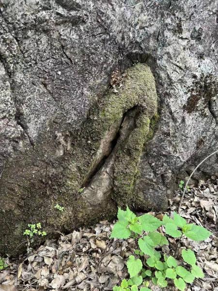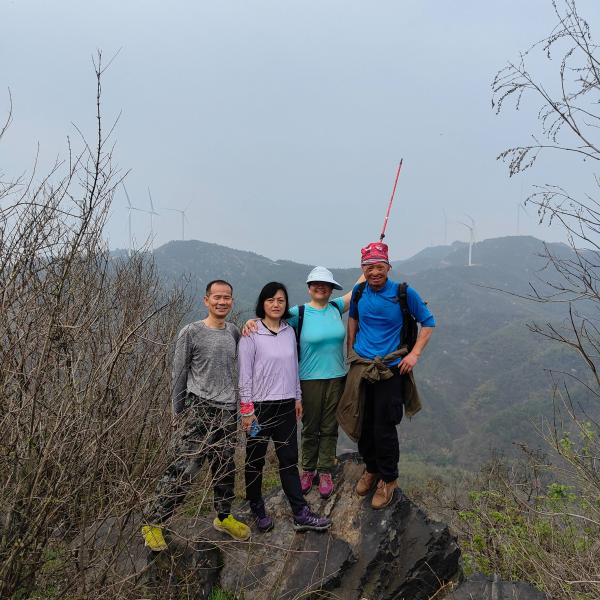观花而未得。这群人铆足了劲向上攀爬,不一会就到437顶了。龙王山顶约面积20平方米,立有一根铁旗杆,西望湘乡山顶发电风车纹丝不动,东南望极目远眺祝融峰巍峨壮观势如飞。东北而望又可见悠悠涓水。若天朗气清,晨间更可见一轮红日从滚滚湘江边喷薄而出,冉冉升腾。北面和南面似乎有下山小径,因为惦记着南面山山的野樱花,大家就从南面下山。一般山峰,南面平缓北面陡峭,我们沿南面山脊下山,不久即到有人工修建的战壕,抑或是争水渠,再往下,南坡峰势险峻,山路陡峭,山石嶙峋,过去以为南坡因为阳光充足,植被丰富,山势应缓,或许是南北争水建设渠道,导致水势集中,冲刷加剧而陡峭。幸运的是洪水造就了奇石林立,于风景是极好。我发现了一处“玄牝“穴,似乎在印证湖湘文化”