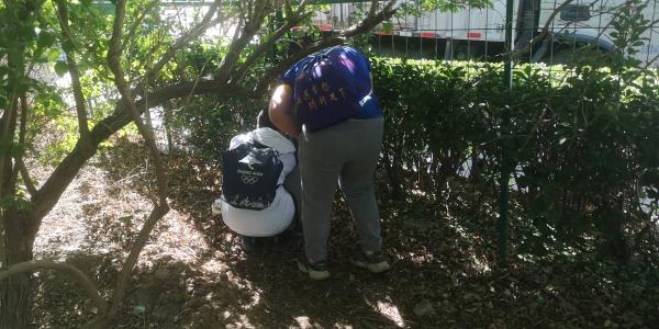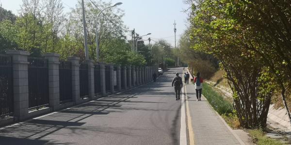在旱河路的东侧辅路开始行走,主路修在高高的河堤上,挡住了视线,我们看不到西侧的旱河。这一侧路边是很安静的公园、采摘园和别墅区,是步行非常友好的地段。我们愉快地找到四个宝。
