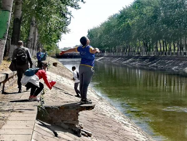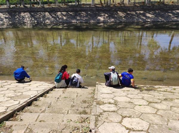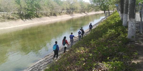 然后就到了永引渠边,旱路变水路。水很清凉,有人模仿夏天溪水里的西瓜,把饮料放下去冰镇一下喝。喝完的饮料瓶,呈上一瓶干净的水,看上去跟卖的水差不多。