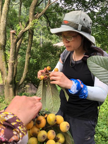 先是来到一户农家老人家很是热情让大家随意采摘他家屋前枇杷树上的果子,大家都很兴奋马上行动起来。