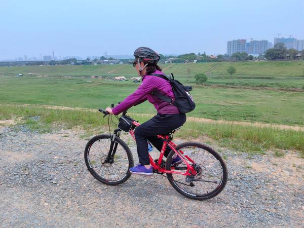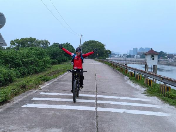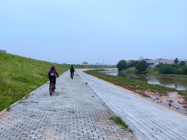 我们先在小河右岸没找到路,返回小河左岸,这是一条新修的大堤,大堤有两条道路,分别是半岸边和顶部,我们在半岸边愉快地骑行着。