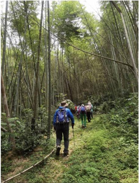 其余八人等到万花到达后抄近道,走山林直线下降,奔向目的地。然这个过程不比第一次下降好多少,所有的路已经没有路的存在了,因为鲜有人走,已经全部被小竹子和荆棘瓜分。我们下得异常艰难,但我们没有了试错返回的时间。于是两驱,四驱,五驱。。。各种姿势交替进行下降,还包括上两驱和下两驱。。。让我再次相信了人类是猴子变来的!